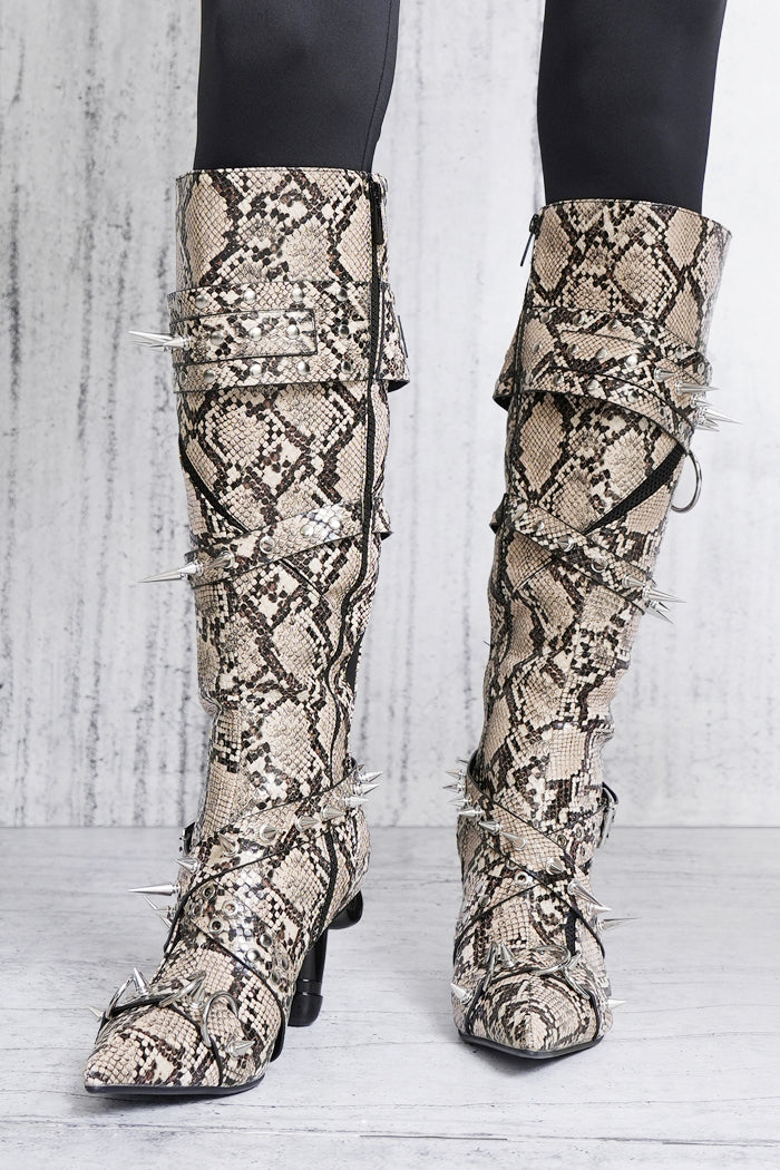 - Namilia dick shaped heel - Spike strap details - Branded zipper - 3D mesh paneling - Black stretch lining - Heel height 3.5" / 9cm - Boot shaft height 19" / 50cm Upper: Vegan leather 100% PU |