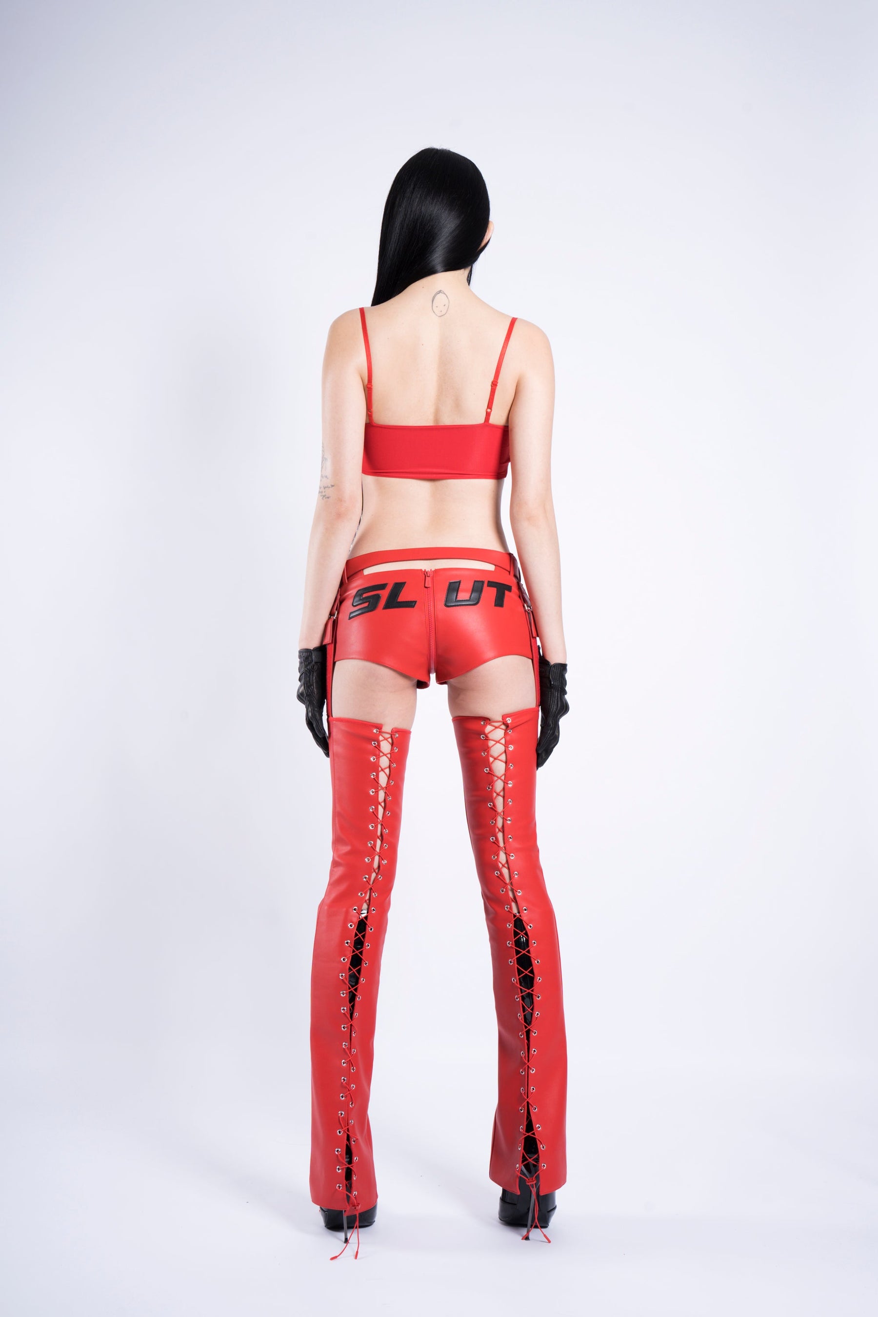 '- Adjustable lacing and suspender straps - Laser-cut 'slut' slogan topstitched on backside - Branded two-way panty zipper - Mesh lining Fabric: Vegan leather 100%PU Tory is 180cm / 5'10" and wears size XS Alex is 180cm / 5'10" and wears size M |