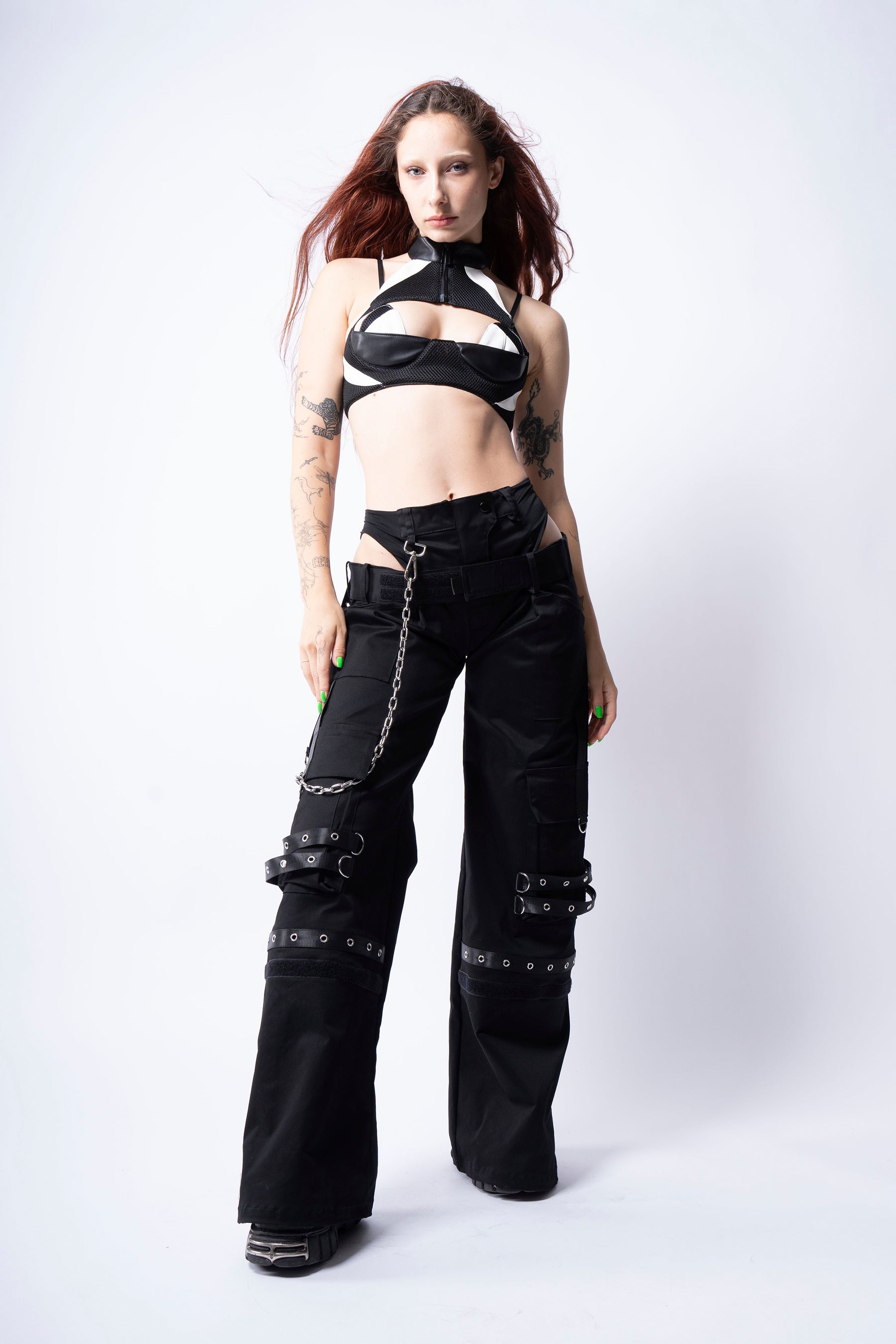 - Corset with motocross paneling - Stretch lycra side and back panel - Branded zipper - Adjustable lacing - Adjustable shoulder straps with velcro fastener Fabric: Vegan leather 100%PU / lycra 90%PL / 10%EA Sayuri is 169cm / 5'5" and wears size XS |