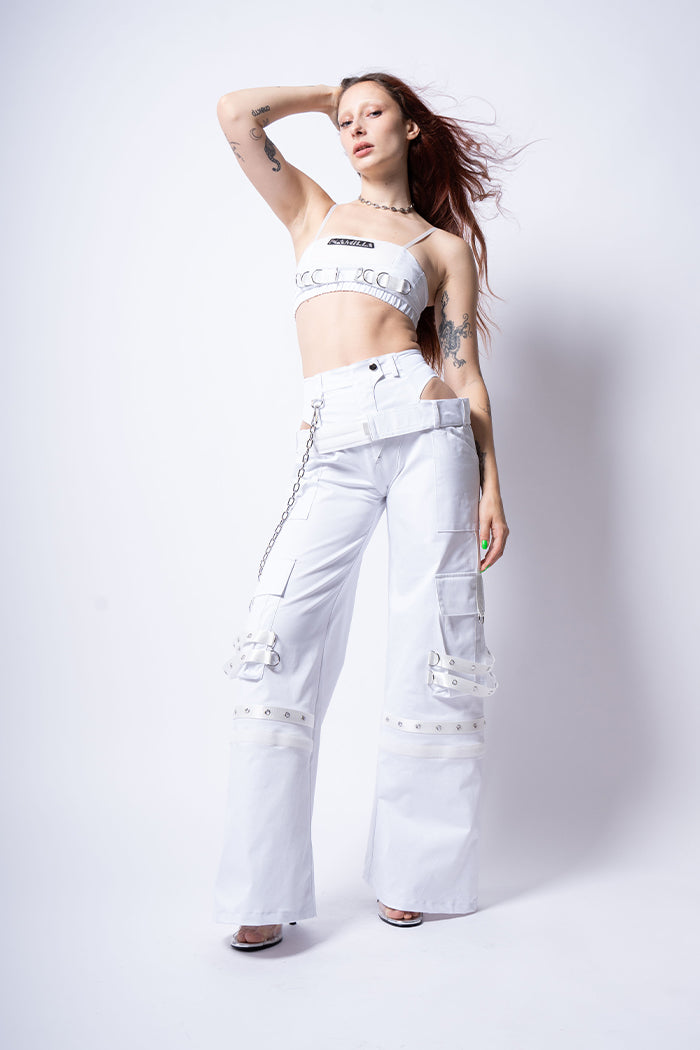 -Wideleg cotton cargo trousers with hipbone cut outs -D-ring hardware, nylon gromet straps, and velcro detailing -Detachable pocket chain -Elastic panty paneling 95% Cotton, 5% Polyester Ines is 173cm / 5'6" and wears size XS |